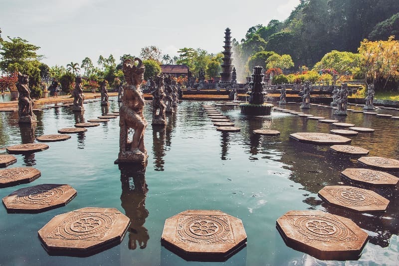 ТиртаГанга (TirtaGangga) королевский водный дворец – это лабиринт бассейнов и фонтанов, окруженный пышным садом, c каменной резьбой и статуями.